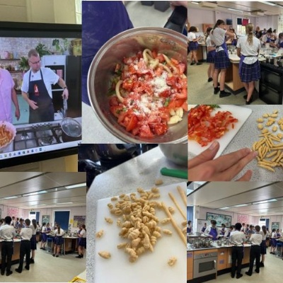 On Tuesday 1st July 50 year 9 students followed a Zoom Cookery Lesson run by Jamie Oliver and his Chefs. We made homemade pasta dough and were shown how to hand shape it in two different ways to form Gnocchetti and Pici Pasta. We also made a fresh tomato sauce that involved very fine chopping of tomatoes, garlic and basil.