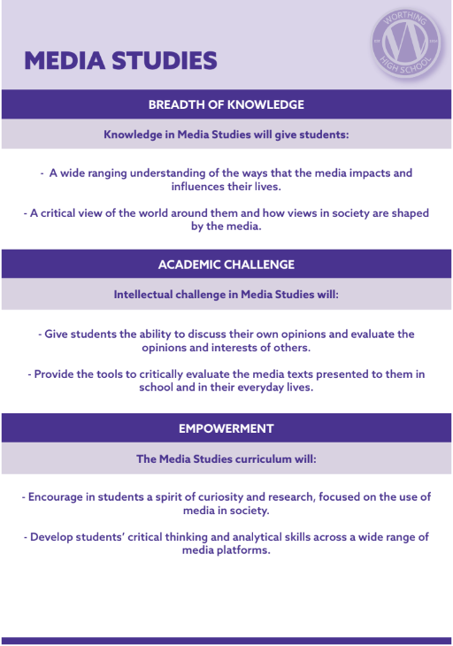 We believe that students bring a wealth of relevant and current knowledge about the media world to their lessons and that this should be explored and developed. We want students to understand the influence that the media has on their lives and to investigate the impact it has on our society.