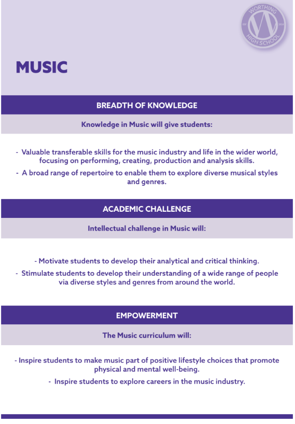Music has 1 lesson per fortnight in Year 7 & 8 and 9. The department follows a musical skills based curriculum exploring techniques in performance, composition and musical analysis. We prepare students for KS4 through exploring a selection of topics from exam board specifications.