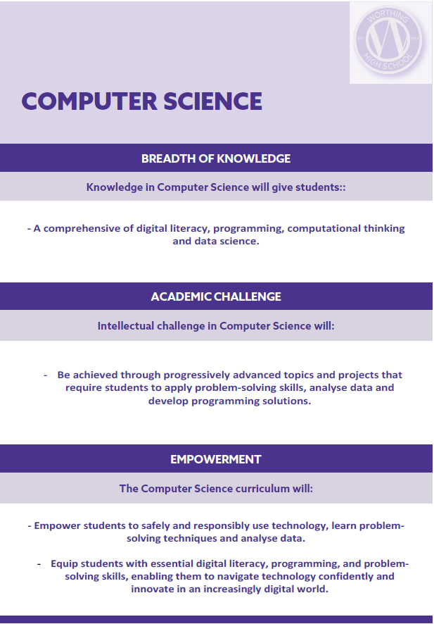 As KS4, students delve even deeper into the above areas by refining their programming abilities, explore advanced algorithms and data structures, and engage in more complex challenges that require rigorous application of their knowledge. The KS4 curriculum further develops their analytical and evaluative skills, preparing them for higher education or careers in technology with confidence and proficiency.
