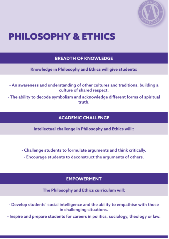 P&E has 1 lesson per fortnight in Year 7, 8 and 9. The department’s programme of study has been written in line with the West Sussex Agreed Syllabus 2015 and was approved at the Agreed Syllabus conference in June 2016. Students are assessed in accordance with the school’s assessment, marking and feedback policy. Students are graded from the very beginning using the 1-9 GCSE criteria.