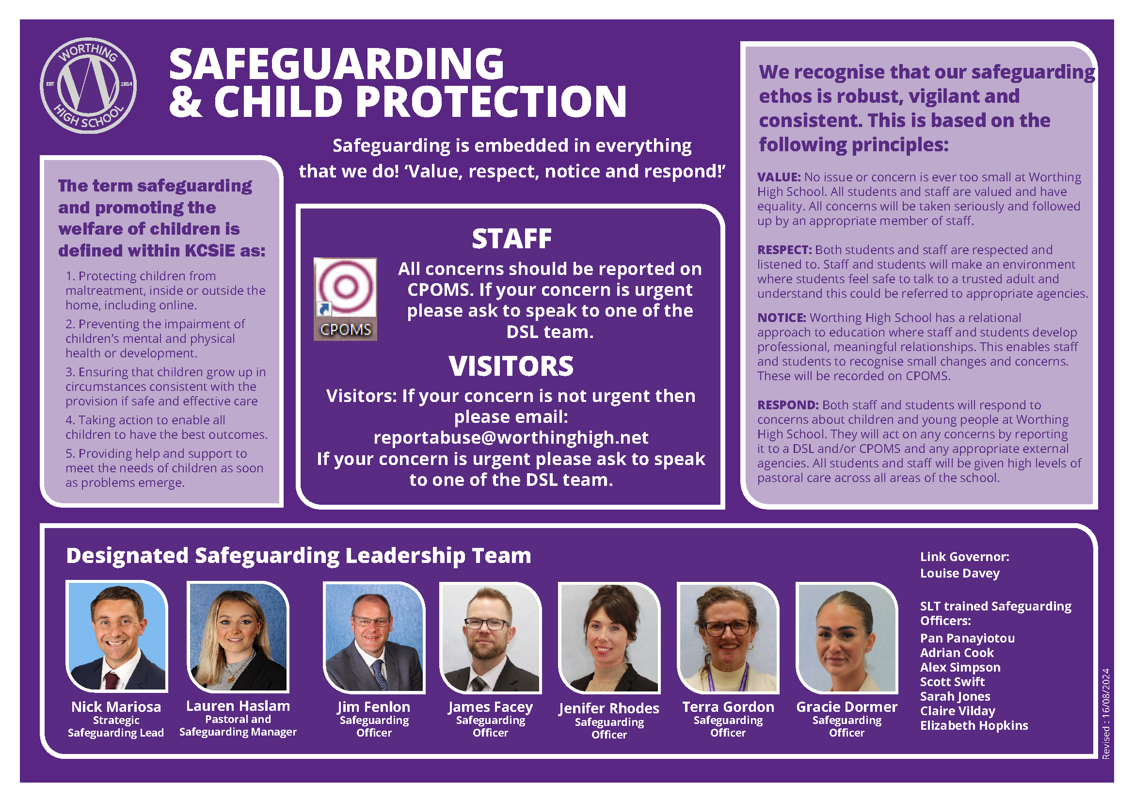 Report Abuse email – As always you can email the school’s safeguarding officers using the report abuse icon on your desktop (if you are a staff member) or directly reportabuse@worthinghigh.net