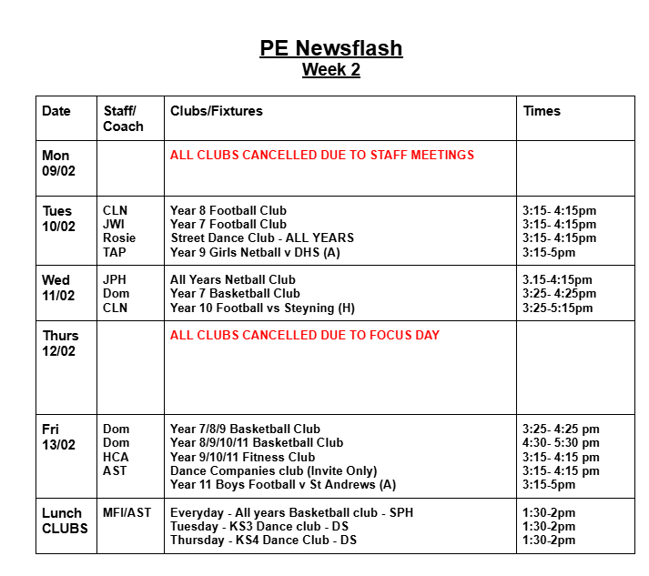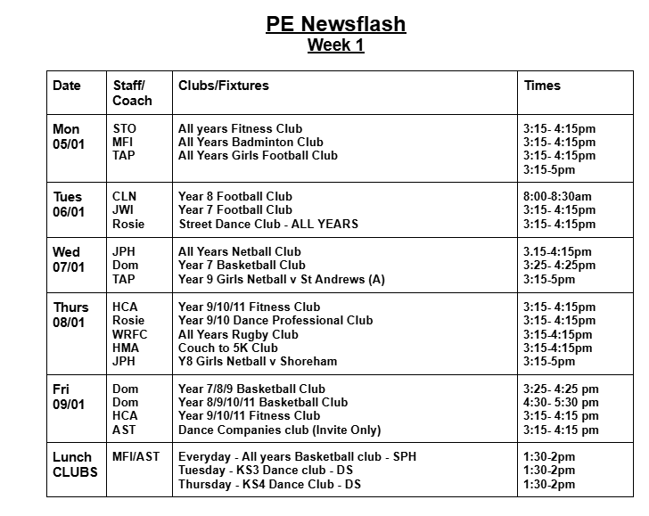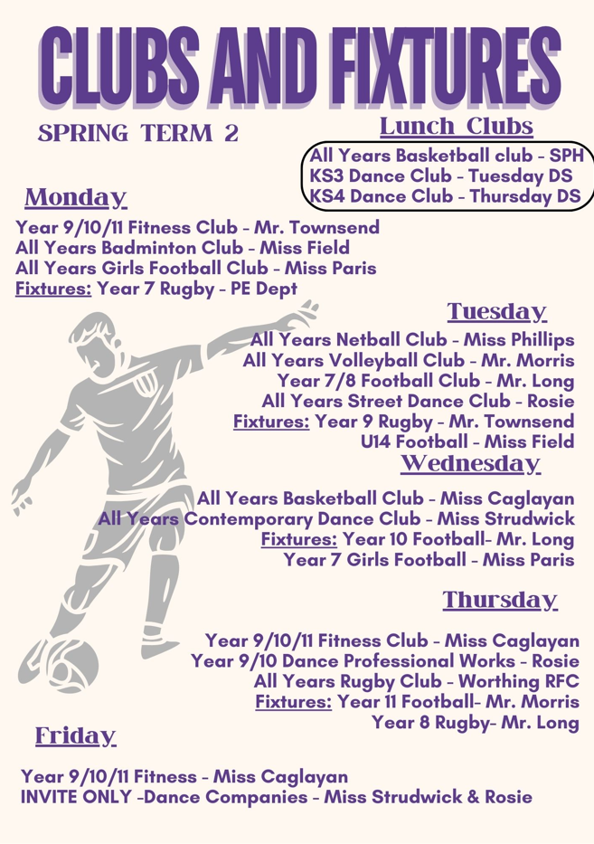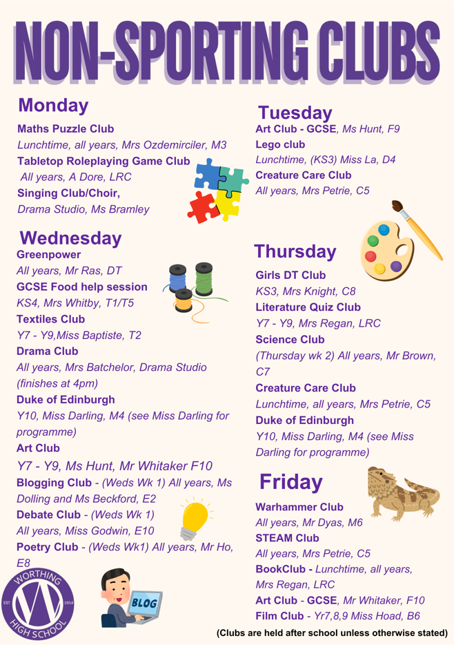 Most clubs will run 3:15pm - 4:15 pm; some clubs run at slightly different times. Please check the club timetable carefully.  All students are welcome to attend clubs.  Registers will be taken weekly. Therefore, there is no need to sign up for a club before it starts.  If students are attending clubs, please can we remind you that students must be in their Worthing High School PE kit.